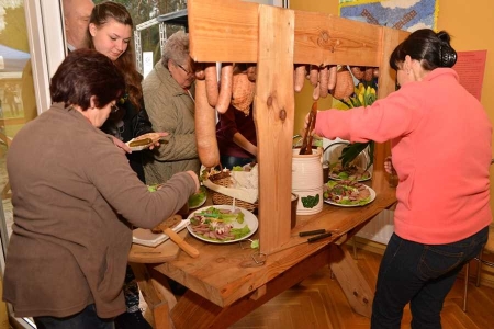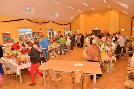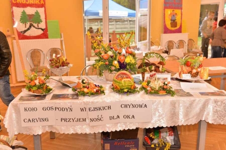 W trakcie Gali na świetlicy wiejskiej trwał w najlepsze kiermasz rękodzieła. Zaprezentowało się na nim 12 sołectw – Dziadkowo, Pakosławsko, Góry, Łazy, Nowy Zamek, Miłosławice, Chojnik, Kocina, Granowiec, Chynowa, Bukowinka i Korzeńsko, które rozstawiły stragany z różnorodnymi cudami wykonanymi ręcznie przez mieszkańców z przeróżnych materiałów – kwiatów z bibuły, dekoracji z papieru, cekinów, wstążek, guzików, szyszek, makaronu, zdobionych różnymi technikami, tj. quling, scrapbooking, decoupage, wyroby z gliny, masy solnej, z ziaren zbóż, wyszywane serwety, hafty, robótki na drutach i szydełku, ekologiczna biżuteria z drewna, wełny, koralików…ach najprawdziwszy jarmark. A do tego nalewki, naleweczki, ciasta i ciasteczka, kapuśniaczki, pierniczki, placki i placuszki. Na świetlicy zgromadziło się chyba tyleż samo odwiedzających co gości pod namiotami na widowni. Jedzenia podczas Gali było w brud, można było wielokrotnie podchodzić do punktów gastronomicznych i za każdym razem wracać do stołu z pełnym talerzem – o stronę gastronomiczną Gali perfekcyjnie zadbało chojnickie Koło Gospodyń Wiejskich wraz ze Stowarzyszeniem – panie nagotowały gary pożywnych zup, bigosu, setki kiełbas, ok. 100 kg pierogów z różnym nadzieniem. Można było do woli jeść wędlin, surówek, sałatek, warzyw, pieczywa, ciast, ciasteczek.