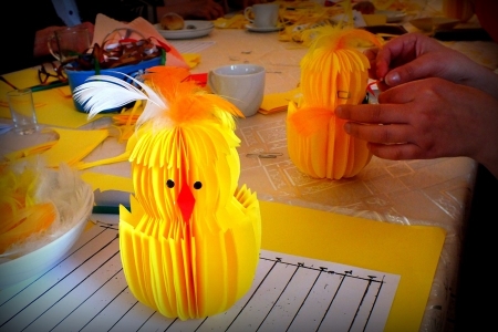 Z Rudy udaliśmy się do Miłosławic – owocowej wsi, gdzie na świetlicy przywitała nas sołtys Teresa Duda oraz członkinie lokalnego stowarzyszenia „Nad Baryczą”. Zostaliśmy poczęstowani sycącym drugim śniadaniem – wyjątkowo smakowały wszystkim bułeczki drożdżowe z owocowym nadzieniem oraz ciasto czekoladowe z owocami (laureat konkursu kulinarnego podczas Święta Sadów 2014). Następnie panie opowiedziały o historii Miłosławic oraz o działaniach na rzecz wsi. Następnie przeszliśmy do warsztatów, podczas których nauczyliśmy się robić kurczaki z papieru.