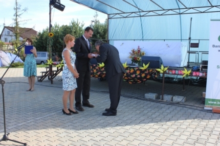 Po mszy świętej starosta i starościna tegorocznych Gminnych Dożynek: pan Maciej Śniatała i pani Anna Fiłka z Granowca wręczyli chleb księdzu proboszczowi Zdzisławowi Naglerowi, a następnie przekazali go Wójtowi Gminy Sośnie – Krzysztofowi Bochenowi.