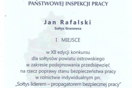 Sołtys naszej wsi zajął I miejsce w XII edycji konkursu dla sołtysów z terenu powiatu ostrowskiego w zakresie podejmowania przedsięwzięć na rzecz poprawy bezpieczeństwa pracy w rolnictwie indywidualnym.