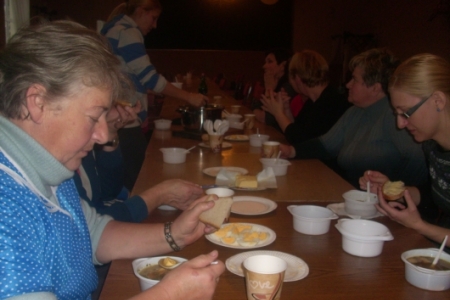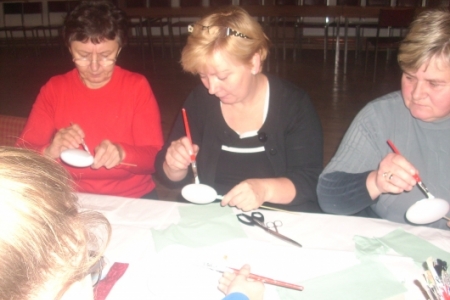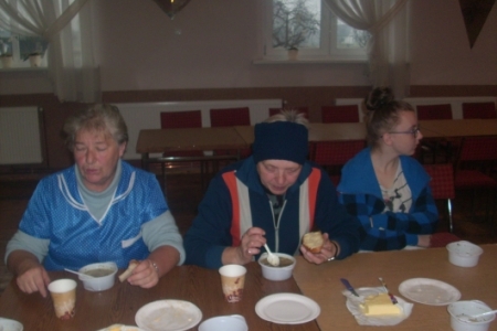 Na zajęciach prowadzonych przez panie Arletę Orłowską i Annę Firer, każdy ozdobił samodzielnie bombkę i serduszko z użyciem wybranych przez siebie motywów. Warsztat odpowiedni zarówno dla osób początkujących, jak i tych, którzy chcieliby rozwinąć swoją technikę - głównie o umiejętność naklejania motywów na przedmiotach okrągłych. Nasze kursantki już dziś pytały o kolejne spotkanie i poznanie kolejnej metody decoupage, dlatego wspólnie ustalimy następne warsztaty. Po zakończeniu warsztatów posililiśmy się smaczną zupą, którą ugotowała dla nas pani Janinka.
