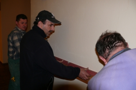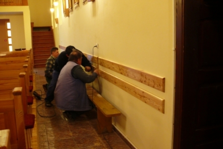 W środę 18 kwietnia panowie: Adam Skrzypczyk, Sławomir Kasprzyk oraz Tomasz Szymonik montowali w kościele przygotowane przez Tomasza Szymonika listwy na ścianach, które mają poprawić estetykę wnętrza i jednocześnie przeciwdziałać brudzeniu się odzieży. W porządkowaniu po realizacji zadania pomagała pani Sołtys.