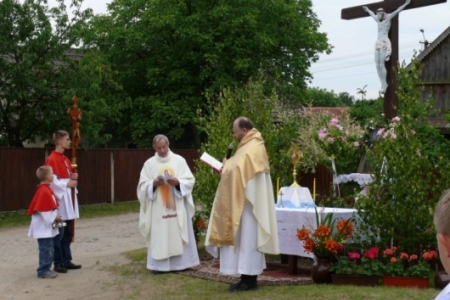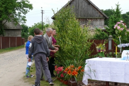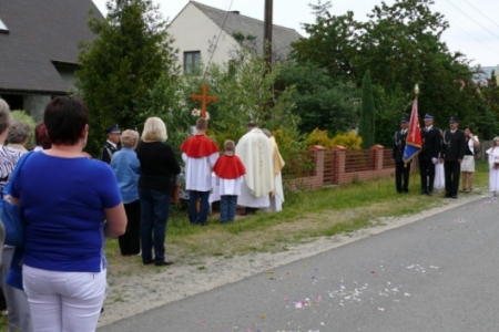 Ołtarze były usytuowane od państwa Krupy w stronę kościoła. Dziewczynki posypywały drogę procesji kwiatami, śpiewano pieśni ku czci Najświętszego Sakramentu, a nasi strażacy służyli pomocą niosącemu Święty Sakrament kapłanowi. To ważne kościelne święto licznie zgromadziło naszych mieszkańców, którzy oddali cześć Ciału i Krwi Pańskiej.