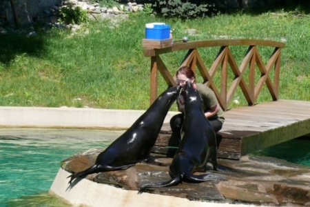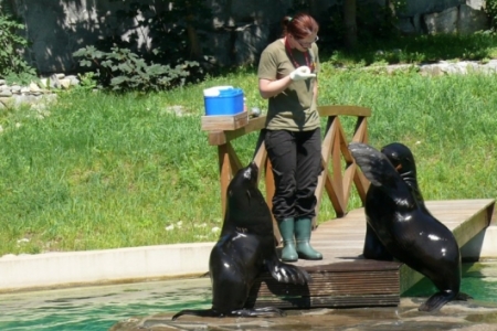 Najciekawiej było przy basenie dla kotików afrykańskich, które można zobaczyć z dwóch poziomów: pod i nad wodą. Podczas pokazowego karmienia podziwialiśmy Jojo, Mandisę i Nelsona, które na polecenie opiekuna zoo robiły różne ewolucje wodne oraz lądowe.