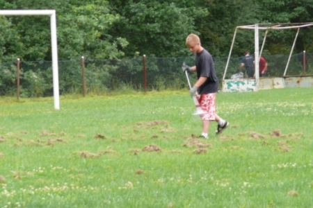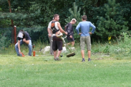Dwa tygodnie poprzedzające festyn, to okres intensywnych prac na boisku sportowym w Łazach Wielkich. Zaniedbywany przez wiele lat teren wymagał teraz sporego nakładu prac, aby przywrócić mu choć odrobinę wcześniejszej świetności. Rozpoczęto od pozbierania śmieci i wykoszenia trawy zarówno na boisku, jak i w jego okolicy. Udało się również wyrównać teren za szatnią, na którym zlokalizowana była hałda ziemi. Po pracach „podwórkowych” przyszła kolej na szatnie. Jedno z pomieszczeń wymagało ponownego tynkowania, pozostałe zostały odmalowane, uruchomiono również toalety – wszystko to dzięki pomocy finansowej Wójta Mirosława Drobiny oraz wolontariackiej pracy piłkarzy i sympatyków klubu. Najpiękniejsze jest to, że nikogo nie trzeba było prosić i że tak wiele osób się zaangażowało. Szczególne podziękowania należą się: Bogdanowi Kowalowi, Ireneuszowi Iwanickiemu, Mariuszowi i Sylwii Iwanickim, Przemysławowi Motylowi, Piotrowi Skrzypczykowi, Krzysztofowi Naporze, Mateuszowi Warczakowi, Hubertowi Kulejowi i Krzysztofowi Chaszczewicz.
