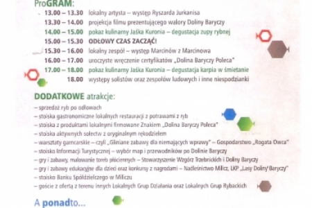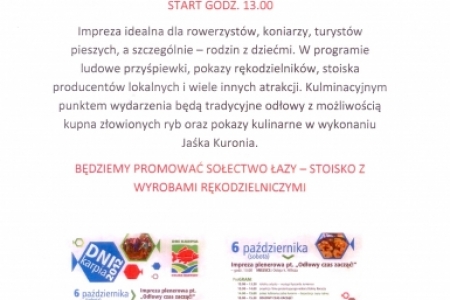 Natomiast w sobotę 6 października zapraszamy na 13.00 na Ostoję. Impreza idealna dla rowerzystów, koniarzy, turystów pieszych, a szczególnie – rodzin z dziećmi. W programie ludowe przyśpiewki, pokazy rękodzielników, stoiska producentów lokalnych i wiele innych atrakcji. Kulminacyjnym punktem wydarzenia będą tradycyjne odłowy z możliwością kupna złowionych ryb oraz pokazy kulinarne w wykonaniu Jaśka Kuronia. Będziemy promować sołectwo Łazy - stoisko z wyrobami rękodzielniczymi.