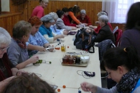 Przedstawicielki Łaz ponownie odwiedziły koleżanki z Bukowic. Tematem warsztatów była drewniana biżuteria, która nawiązuje do projektu „Wioska drewna”. Uczestniczki wykonały piękne kolorowe korale oraz bransoletki. Po pracy przyszła kolej na rarytasy. Próbowałyśmy wyśmienitych swojskich serów, masła, powideł wykonanych przez panią Beatę Piekalską w jej gospodarstwie w Lędzinie