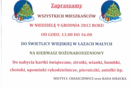 Natomiast w niedzielę 9 grudnia zapraszamy na kiermasz bożonarodzeniowy. Odbędzie się on również w świetlicy w Łazach Małych w godz. 13.00 – 16.00. Oczywiście głównym asortymentem będą ręcznie wykonane przez mieszkanki ozdoby m.in. bombki, wianki, stroiki, choinki i wiele innych.