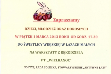 Stowarzyszenie „Aktywne Łazy” zaprasza dzieci, młodzież i dorosłych do świetlicy wiejskiej w Łazach Małych na warsztaty z rękodzieła pt. „Wielkanoc”.