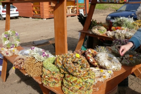 Pierwsze skrzypce jednak grały wyroby rękodzielnicze. Bajecznie kolorowe stoiska z tańczącymi na wietrze aniołami, kwiatami, szmacianymi cudnymi lalkami z lnu i bawełny. Piękne , kolorowe wyroby ze szkła: bombki na choinkę, wazony, patery.