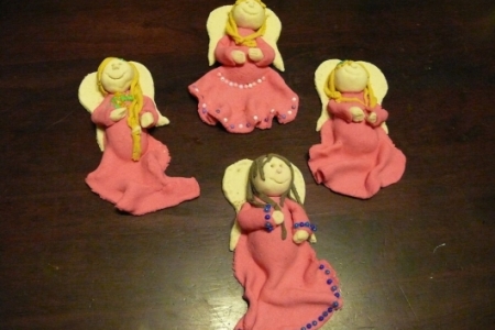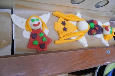 18 grudnia – ostatnie warsztaty. Podczas ostatnich warsztatów chcieliśmy uczestnikom pokazać, że masa solna to nie tylko lepienie figurek, że stworzenie figurki to dopiero początek wspaniałej przygody... Mając farby, koraliki, wstążeczki, piórka i co nam tylko wpadło w ręce przystąpiłyśmy do ozdabiania wcześniej ulepionych aniołków.