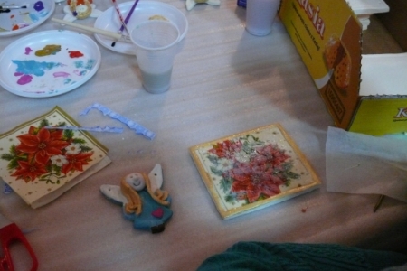 Podczas drugiej części warsztatów prowadząca pokazała jak wykorzystać bazę z masy solnej do decoupagu. Powstały przepiękne tabliczki solne z motywami bożonarodzeniowym (bo przecież to już prawie święta), a uczestniczki poznały jak metodą serwetkową szybko i efektownie można przyozdobić nawet masę solną.