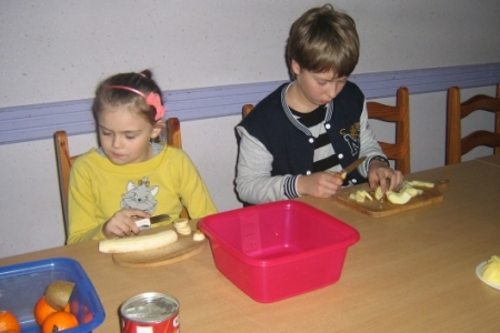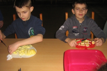 19 lutego dzieci przygotowały sałatkę owocową. Nawet te najmłodsze świetnie poradziły sobie z krojeniem bananów, jabłek, kiwi, ananasów, brzoskwiń i mandarynek.