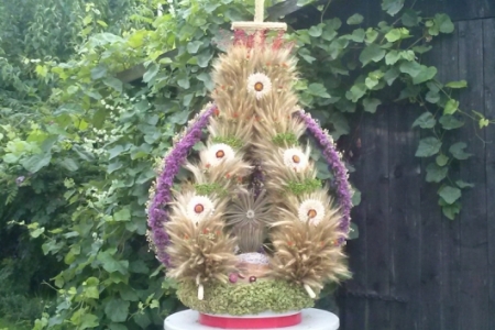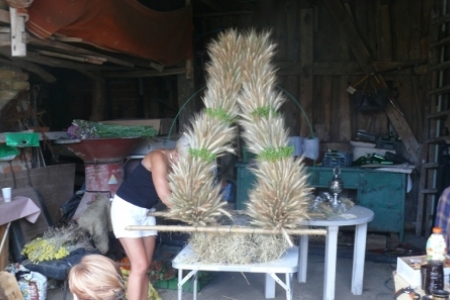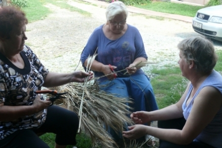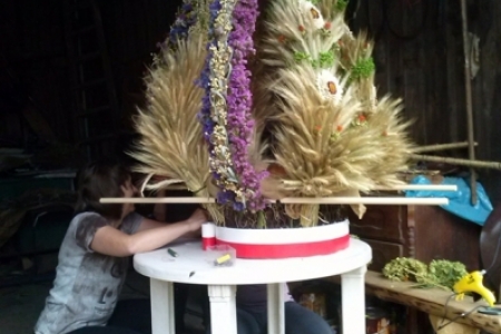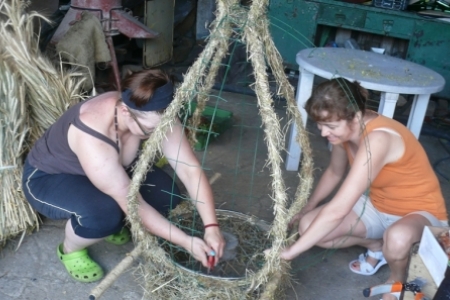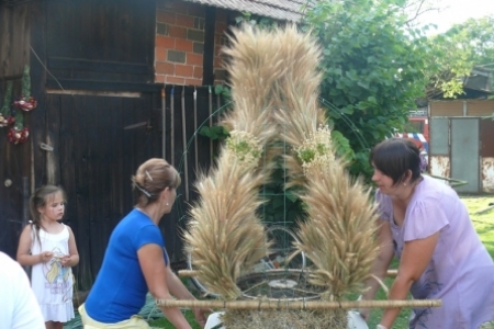 Nasz wieniec był wykonywany przez mieszkańców przez 2 dni. Grupa kilkunastu pań w różnym wieku oraz jeden pan, który służył nam pomocą, wykonała przepiękną koronę - wieniec dożynkowy. Oprócz zbóż wykorzystane zostały różne materiały roślinne: suchołuski, hortensje, zatrwian, trawy, makówki, len, pestki dyni... Wieniec był prezentowany podczas dożynek parafialnych 15 sierpnia, a teraz czeka na dożynki gminne 6 września.