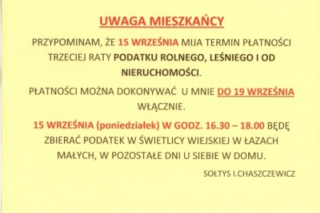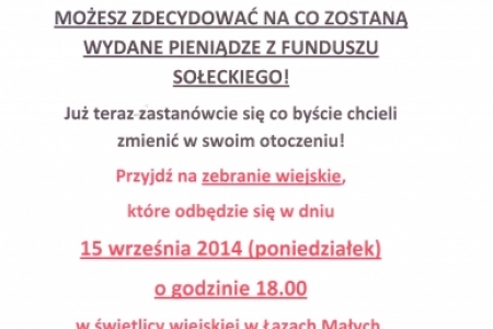 15 września - zebranie wiejskie dotyczące funduszu sołeckiego na rok 2015 - świetlica w Łazach Małych godz. 18.00