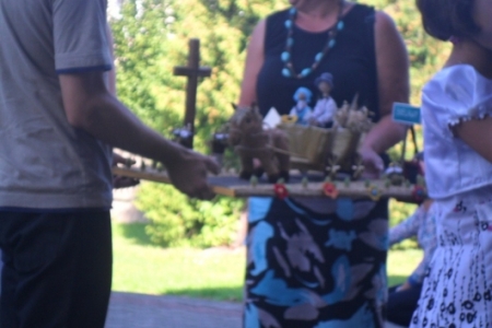 Zebrani przed Kościołem z pięknymi wieńcami dożynkowymi, chlebem z mąki pochodzącej z tegorocznych zbiorów, oraz pieśnią na ustach „Plon, niesiemy plon”.