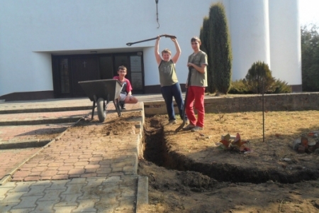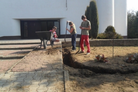 Ciężką pracę usunięcia starego, betonowego ogrodzenia oraz wykopania dołu pod fundamenty wykonała grupa mieszkańców z Brzeziny i Pakosławska pod wodzą sołtysa H. Kuriaty.