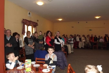 W wypełnionej świetlicy zaśpiewano gromkie „sto lat”, po czym kobiety z lampkami wina zasiadły przy suto zastawionych stołach, na których znalazły się m.in. krokiety z barszczem, kiełbasa na gorąco, bigos, sałatki, jajka w majonezie, wędliny, placki, kawa i herbata.