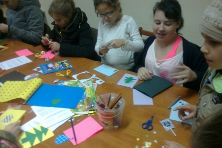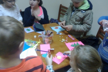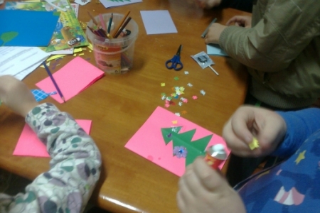 Na zajęciach plastycznych dzieci miały szanse użyć swojej wyobraźni i zdolności artystycznych. Wykonywały kartki świąteczne według własnych pomysłów. W tym celu miały dostęp do różnorodnych ozdobników-brokatu, wstążek, bibuły, kolorowych wycinanek i wielu innych.
