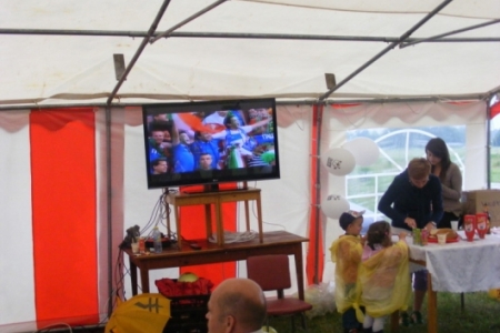 A po godzinie obfite opady deszczu, które spowodowały ,że część rodziców wraz z dziećmi wróciła do domu.Ci, którzy zostali bawili się doskonale. Ile frajdy może przynieść zabawa w deszczu, wie każdy,kto w dzieciństwie doświadczył tej zabawy. Dzieciaki szalały a dorośli obejrzeli mecz. Wszyscy raczyli się słodyczami, ciastami upieczonymi przez mieszkanki Joachimówki, drożdżówkami z Piekarni Familijnej,lodami z Parkowej i kielbaskami z grilla.