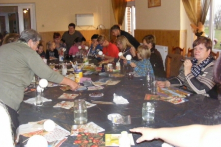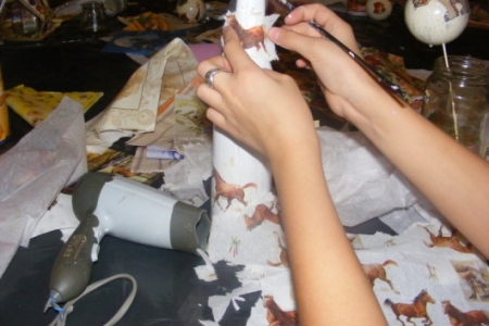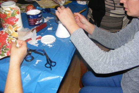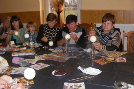 W środę, 23 października odbyły się kolejne warsztaty w ramach Akademii Niezwykłych Umiejętności.Tym razem instruktorki z zaprzyjaźnionego Chojnika odkrywały przed nami tajniki nowej techniki-decoupagu.Na pierwszy rzut poszły styropianowe bombki.Każda z uczestniczek malowała,naklejała kolorowe wzory z serwetek aby potem wszystko polakierować,obsypać brokatem i doczepić zapinkę ze wstążki.Miło było podziwać powstające cudeńka.Zachęcone efektami swojej pracy uczestniczki zajęć przystąpiły do zdobienia butelek, słoików i wazoników.Wszystko to można podziwiać w galerii zdjęć.W warsztatach udział wzięło ponad 20 osób.Wiele z pań deklarowało chęć kontynuowania zajęć.W naszych planach jest przygotowanie gadżetów promujących wieś końską.