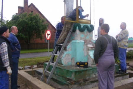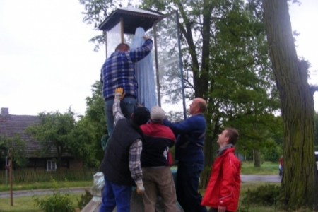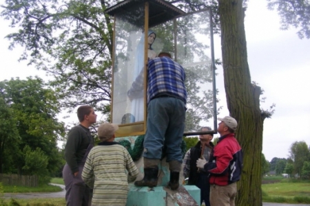 Rozpoczęły się prace związane bezpośrednio z renowacją I kapliczki.W maju ,dzięki pomocy Zakładu Rybackiego w Potaszni,udało nam się zlikwidować "dziki przejazd " przez skwer,na którym znajduje się kapliczka.Nawieziona została ziemia,posiana trawa i przesadzone krzewy.Teraz zdemontowana została figurka i jej osłona.Trwają prace renowacyjne cokołu,które przeprowadzają Zdzisław i Szymon Okrutnikowie- mieszkańcy sołectwa.Kapliczka odzyska dawny blask. Ponadto odnowiona zostanie figurka Maryji i zamontowana zostanie nowa osłona.Prace te są możliwe dzięki pozyskaniu przez stowarzyszenie "Brapoja" środków finansowych z Europejskiego Funduszu Rozwoju Wsi Polskiej.