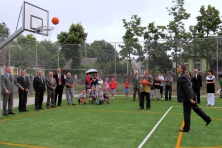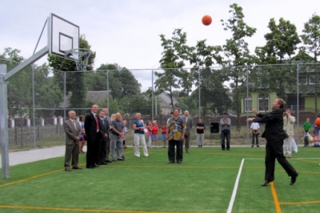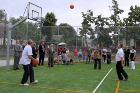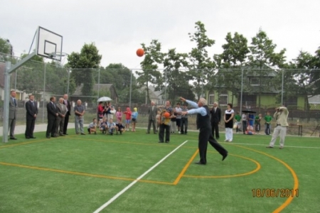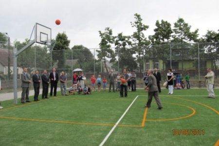 Po uroczystym przecięciu wstęgi, nastąpiło wystąpienie zaproszonych gości, którzy wręczyli uczniom upominki w postaci sprzętu sportowego, niezbędnego do korzystania z nowego boiska. Następnie, każdy z przybyłych gości miał okazję wykonać honorowy rzut piłką do kosza.