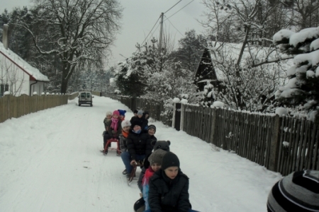 Dnia 22.02.2013r. w godzinach południowych cała społeczność szkolna w pełnej gotowości dotarła do Ośrodka Jeździeckiego ,,Jurand” Pana Jerzego Kątnego. Na miejscu czekały już zaprzęgi konne z saniami oraz miejsca przy ognisku. Wszystko dopięte było na ostatni guzik. Saneczki z młodszymi dziećmi, dla bezpieczeństwa, ciągnęły małe koniki. W przerwach pomiędzy przejażdżkami, w salce Ośrodka Jeździeckiego czekała na uczestników gorąca herbata oraz pyszna grochówka przygotowana przez mamy z Rady Rodziców. To nic, że zdarzyło się komuś zanurkować w puszystym śniegu, z rumianymi policzkami i zdrowymi uśmiechami , wróciliśmy do domów . Będzie co wspominać do następnej zimy…