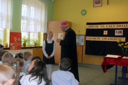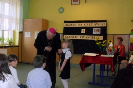 Dostojnego gościa uczniowie powitali radosną pieśnią: ”Oto jest dzień, który dał nam Pan”. Pani Dyrektor Renata Skorupa witając naszych Gości, przypomniała historię szkoły , wspomniała o walorach miejscowości, a także wyraziła wdzięczność za współpracę z Księdzem Proboszczem. Następnie uczniowie przedstawili scenę z życia Pana Jezusa. Uwieńczeniem były życzenia , kwiaty i upominki złożone na ręce ks. Biskupa.