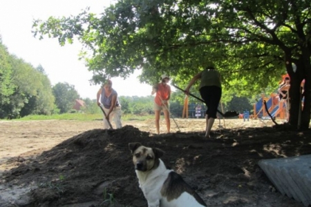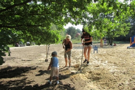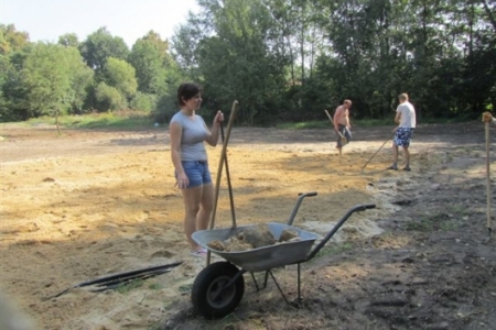 Zaczęliśmy prace od 16 i 18 lipca - przy terenie rekreacyjnym i placu zabaw, 19 lipca rozpoczęto prace przy boisku do piłki nożnej, a międzyczasie dojrzeliśmy do boiska do piłki plażowej. Już 4 sierpnia montowano nam urządzenia na placu zabaw. Rosły kolorowe, przyciągające dzieci zabawki – ale jeszcze nie można było się pohuśtać i zobaczyć do czego jest taka ścianka z „dużymi guzikami” – no i to marzenie żeby dorośli zdążyli przed jesienią. Dopiero 27 sierpnia mogliśmy wejść na plac „budowy” – to było prawdziwe „pospolite ruszenie”. Od rana huczały piły i kosiarki, grabie, łopaty i taczki cały czas w użyciu. Rodzice pracowali a dzieci już szalały na urządzeniach. Kilka godzin tego dnia trwały prace a na koniec trzeba było wyraźnie sobie powiedzieć, że czas już do domu bo chyba noc by nas zastała.
