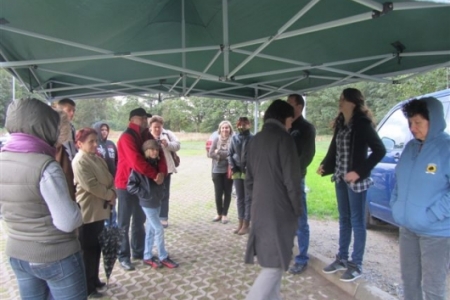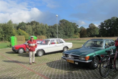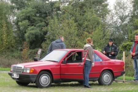 O 11 godzinie niebo się zachmurzyło i zaczął padać deszcz, dodatkowo przenikające zimno „wgoniło” oczekujących mieszkańców pod rozpięty przez przewidujących organizatorów dach namiotu. Przez blisko godzinę, dzielnie przytupując z zimna, oczekiwaliśmy na dwuślady, a jedynymi pojazdami były nasze jednoślady ustawione na parkingu. No i w końcu zajechał o 12.03 pierwszy mercedes a później co kilka minut następne stare mercedesy. Oczekując na samochody zajęliśmy się materiałami o Dolinie Baryczy przyniesionymi przez niezawodną p. Zosię Pietrykę – dzięki temu i realizowanemu przez nas programowi „Ruda Milicka - ptasi raj” mogliśmy bezbłędnie odpowiedzieć na pytanie 8 (i nie tylko) testu z wiedzy o Dolinie Baryczy, przygotowanego dla kierowców: „Z wymienionych gatunków ptaków, podkreśl 5 występujących na stawach milickich: wodniczka, błotniak stawowy, orzeł przedni, flaming, bąk, czapla siwa, kakadu, kormoran, żuraw” – choć kto wie może w wyniku ocieplenia klimatu doczekamy się na kakadu i flaminga – też pięknie prezentowałyby się w naszym „ptasim raju”. Nie wiemy czy któryś z kierowców postawił jednak na kakadu.