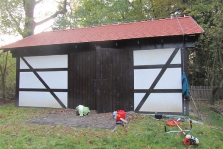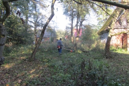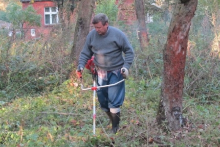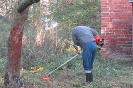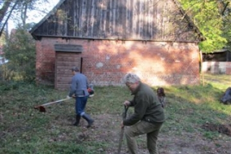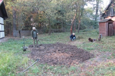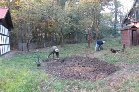 Wydawało się nam, że szybko wykosi się trawę, przekopie kawałek gruntu pod rośliny i jeszcze na popołudniowe porządki domowe zostanie trochę czasu – a tu - okazało się, że mamy do czynienia niemal ze stanowiskiem archeologicznym. Trawa i chwasty porosły i przykryły pozostawione po remoncie druty, deski, gałęzie, kamienie, butelki i wiele innych niespodzianek. Naskładało się tego na ogromny wór, każda przekopana skiba też ujawniała nowe „skarby” Pan Romek przebijał się kosiarką spalinową przez chaszcze a jako jedyny mężczyzna jeszcze podcinał suche gałęzie drzew. W ruch poszły łopaty, grabie, podcinarka akumulatorowa, sekatory. Porządkowanie trwało do zachodu słońca. Pracom przyglądały się dwa psy, którym się wydawało, że poszły na spacer. Przed Chatą posadzone zostaną irgi, berberysy, derenie jadalne, jarzębina i głogi. Wstępny termin nasadzenia 14 -15 listopada.