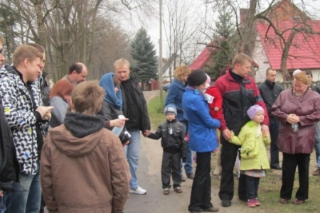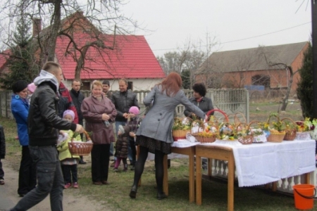 Mieszkańcy Rudy Milickiej rano zebrali się pod krzyżem z pięknie przystrojonymi koszykami. Przybyli całymi rodzinami. Jak zwykle najbardziej przejęte były dzieci, których jest sporo w naszej małej miejscowości – niektóre dzieci dopiero pierwszy raz mogły przyjść w Wielką Sobotę. Ksiądz poświęcił pokarmy i wodę, wszyscy złożyli sobie świąteczne życzenia.