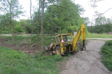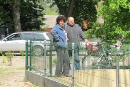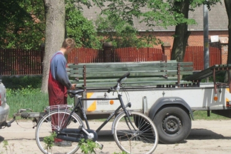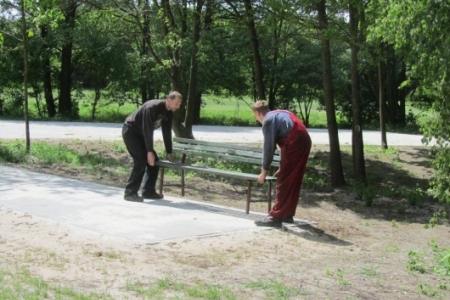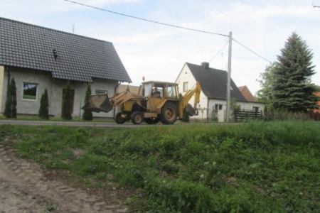 Pod drzewami na skwerku przy placu zabaw dla dzieci, bo tam na utwardzonym placyku w czwartek postawione zostały ławki. Zarówno rodzice pilnujący dzieci, jak i ci, którzy chcą po prostu posiedzieć, pogawędzić z kimś i odpocząć już mogą to zrobić w ładnym otoczeniu. Również wzdłuż ścieżki rowerowej przy boisku stoi siedem ławek, kibicując na meczu można posiedzieć wygodnie a nie na trawie. Oczywiście turyści jadący rowerami też mogą odpocząć pod warunkiem, że będą przestrzegać pewnych reguł: zabierać ze sobą swoje śmieci i szanować naszą pracę – bo przecież sami wszystko robimy a mieszkańcy bardzo dbają o swój teren rekreacyjny. Pan Stanisławski przygotował ławki do ustawienia a pani Regina jak zwykle przyszła natychmiast jak przywieźli ławki, żeby pomóc jeśli będzie taka potrzeba. Pani sołtys też ustawiała a ja mogę zaświadczyć, że siedzi się wygodnie. Po południu w piątek przy naszym rowie pracował już spychacz, przygotowując rów do zasypania.