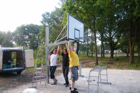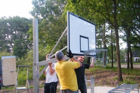 Wydawało nam się, że zamontowanie takich koszy to chwilka – bo przecież otwory były zostawione, a więc tylko osadzić słupy. Jednak biorąc pod uwagę to, że częścią piłki do kosza jest koszykarz – bo dla fasonu musi na koszu po wrzuceniu zawisnąć – to cała konstrukcja musi być na te obciążenia odporna. Na zdjęciach widać jakie to trudne i wymagające odpowiedniego sprzętu zajęcie.
