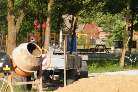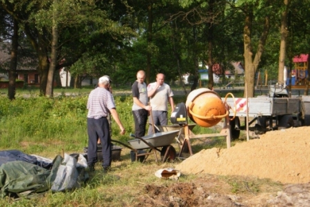 Mieszkańcy Rudy Milickiej z pomocą sąsiadów szlifują boisko wielofunkcyjne i jego otoczenie.
