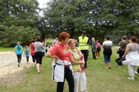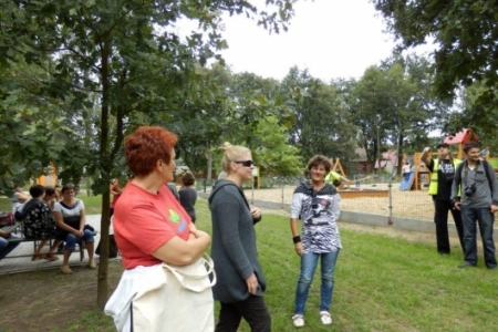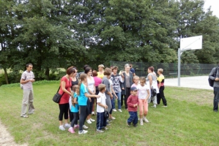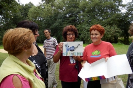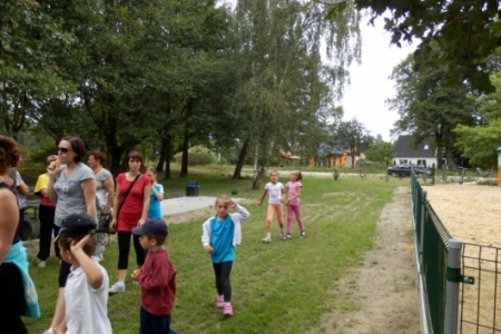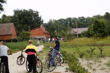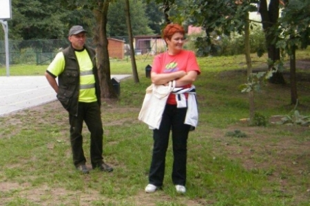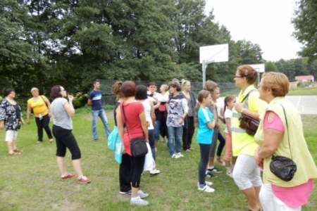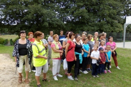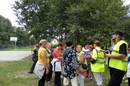Był to rajd rowerowy między innymi z trasą przez kompleks Stawno, a u nas uczestnicy wycieczki chcieli zobaczyć co udało nam się zrobić w naszej wsi w ostatnim roku. Można powiedzieć, że to nieskromnie, ale my uwielbiamy chwalić się tym, że wszystko co się we wsi dzieje, udało się nam zrobić dzięki aktywności mieszkańców. No i pochwaliliśmy się naszym placem rekreacyjnym i tym, że mamy trzy boiska i tym, że na domach pojawiły się tabliczki z ptakami i naszymi krzewami róż i naszymi projektami. Dostaliśmy piękny upominek – czaplę zrobioną niespotykaną techniką – mamy nadzieję, że to jest piękny początek do naszej wymarzonej galerii. Dziękujemy wszystkim uczestnikom za zainteresowanie i za wnikliwe pytania.