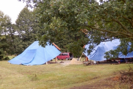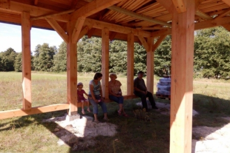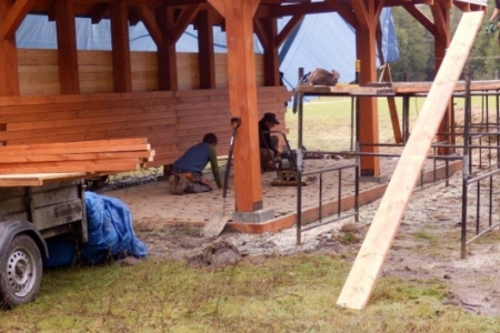 Kolejny tydzień trwają prace przy dwóch wiatach – główne czynności wykonuje przedsiębiorstwo specjalistyczne, ale bez codziennej obecności Pani Sołtys i pomocy mieszkańców w przygotowywaniu miejsca wokół wiat nie dałoby się tak sprawnie wszystkiego zorganizować.