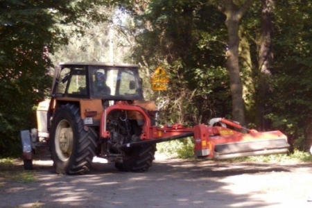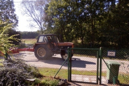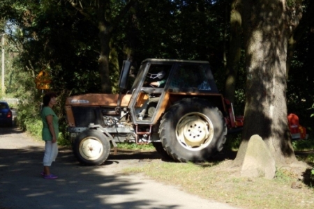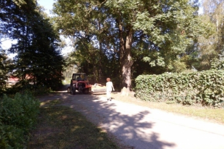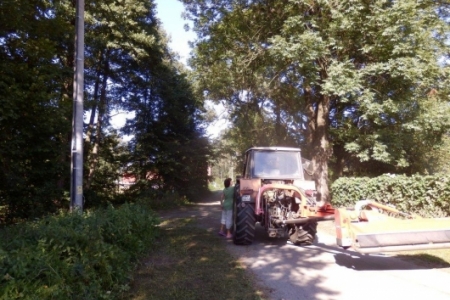 Na plac zjechały maszyny z drewnianą kostką brukową i dachówkami. Bruki już są kładzione a wiaty przed deszczem zostały przykryte płachtami, a w piątek już kładziono dachówki. Skoro i tak miejsce wymagało codziennej obecności Pani Sołtys zamówiła traktor z kosiarką, który obkosił boisko, łąkę oraz wszystkie drogi i dróżki w Dębowie.