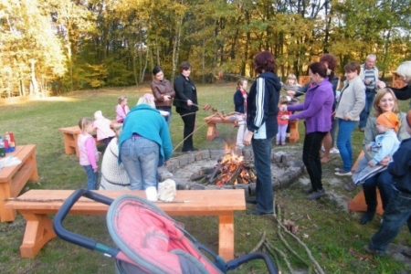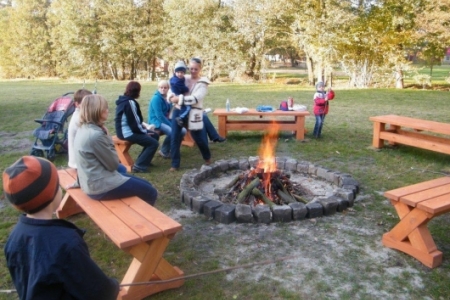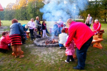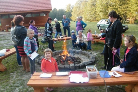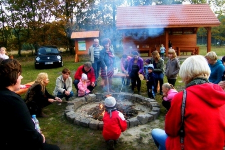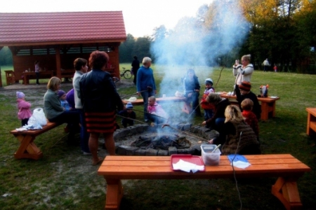 20 października po sadzeniu krzewów, korzystając z ładnej jesiennej pogody, przyszedł czas na pierwsze rozpalenie ogniska. Wszyscy z ochotą zabrali się do wyszukiwania patyków żeby nadziać kiełbaski, dzieci pomagały przynieść drzewo na ognisko i przed 17 godziną zapłonęło w nowo przygotowanym kręgu.