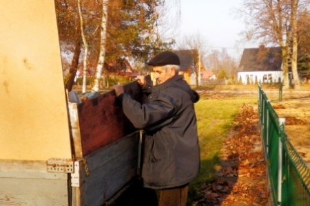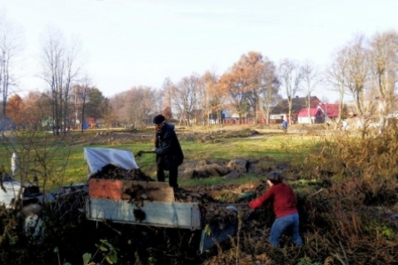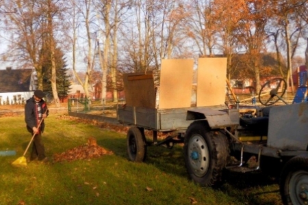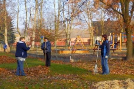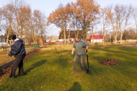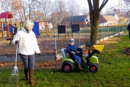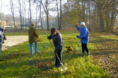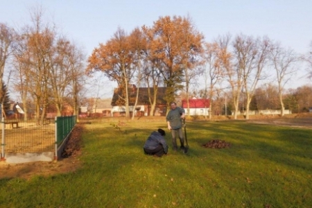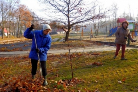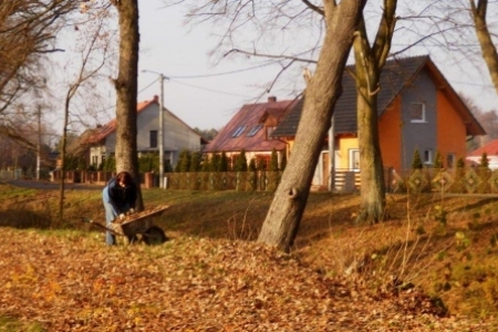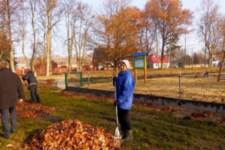 Było to zaproszenie do wspólnej ostatniej pracy w tym roku – nocne przymrozki strąciły ostatnie liście z drzew wokół placu rekreacyjnego w Rudzie Milickiej a ponadto przybyło kilkadziesiąt iglaków do posadzenia zarówno przy placu zabaw jak i wiatach. W sobotę jak na zamówienie była piękna pogoda, przy której praca miała charakter rekreacyjny. Jak zwykle z grabiami, taczkami, łopatami zjawiło się sporo osób – stawiły się głównie panie ponieważ praca była zapowiadana jako lekka, ale z górami liści bez traktorka pana Zygmunta Cieszkowskiego i pracy właściciela nie dalibyśmy sobie rady – metodą do tej pory stosowaną „na płachtę” sprzątalibyśmy kilka dni. A na początku wsi, pod witaczem, samotnie sprzątał liście pan Edward Brzóska. Natura w tym roku była nadzwyczaj hojna i sypnęła na trawnik dywanem jesiennych liści. Po akcji „jesienne sprzątanie” widać już zieleń trawnika, a jeże mają odłożone pod krzakami liście.