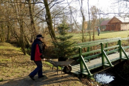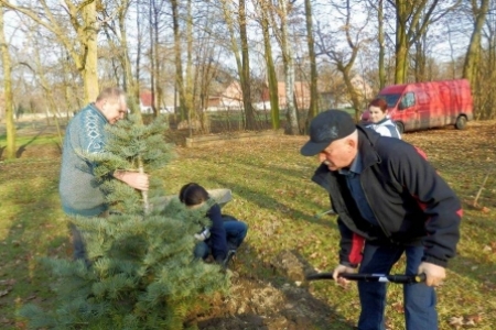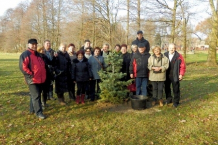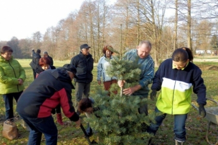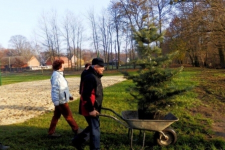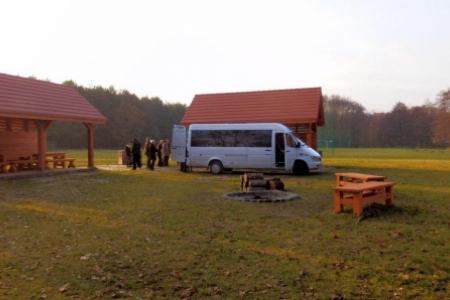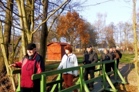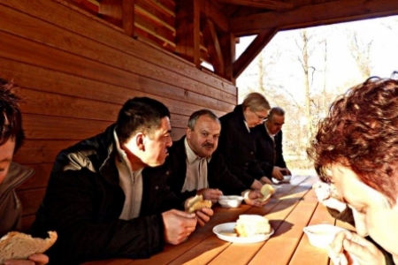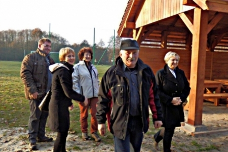 Najczęściej tak mówią o miastach, ale nasi goście byli nadzwyczaj sympatyczni i nie mielibyśmy nic przeciwko temu, by takie spotkania były częstsze. Interesowało ich co trzeba robić, by zachęcić mieszkańców do wspólnej pracy, ale też co udało nam się już zrobić. Rzeszówek też jest wsią, która rozpoczyna drogę do tworzenia charakteru wsi tematycznej: „Wieś pod lasem” jak mówią – swoje domy będą oznaczać różnymi grzybkami. Nasze ptaki na domach też znalazły uznanie. Zaczęliśmy oczywiście od zdjęcia pod witaczem. Na placu rekreacyjnym właśnie trwały prace porządkowe „do ostatniego liścia” i można było sprawdzić w praktyce jak mieszkańcy wspólnie pracują. Ponieważ właśnie kończono sadzenie drzewek to Pan Sołtys z Rzeszówka zasadził u nas przed wiatami sosnę kanadyjską. Zostałyśmy zaproszone na biesiadę pod wiatami ponieważ goście przyjechali z własnej roboty smakołykami. Często oprowadzamy grupy, ale tak zorganizowanej nigdy nie widzieliśmy. W termosach były napoje ale też zupa „z wkładką”, różne mięsa, kiełbasy z dzika, pyszny chleb pieczony we własnym zakresie, no i „środki” pomagające strawić te wiktuały – aż żal, że musieli jechać dalej. Zostało po nich posadzone drzewko, które będziemy pielęgnować tak jak pamięć.