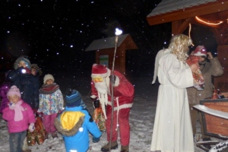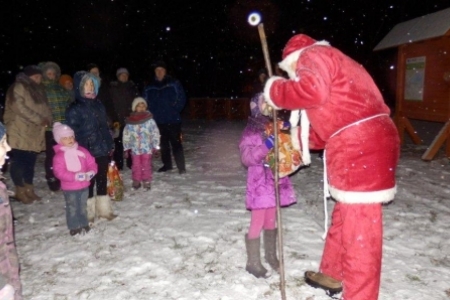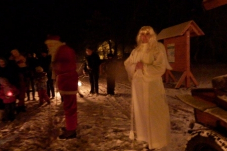 Dzwonki zadzwoniły i pojawił się wóz zaprzężony w dwa koniki – powoził woźnica w futrzanej czapie a za nim siedział Mikołaj z Aniołem i wieźli paczki dla dzieci. Dzieci podchodziły wywoływane przez Mikołaja, który był bardzo dociekliwy i pytał ile dziecko ma lat i czy było grzeczne. Tylko jedna dziewczynka szczerze powiedziała, że nie była grzeczna ale dobry Mikołaj paczkę też dał.