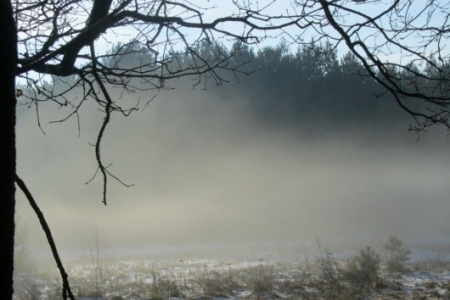 Otaczające nas stawy, przecinająca Rudę Milicką wezbrana teraz rzeka Prądnia, która w pobliżu młyna wodnego spiętrza wody za pomocą jazu, duże ilości rowów doprowadzających wodę do stawów, topiący się śnieg, którego w dalszym ciągu hałdy leżą po północnej stronie ściany lasu, deszcz w ostatnich dniach i rosnąca temperatura powoduje parowanie wody i powstawanie mgieł przesuwających się przez naszą wieś, lasy i stawy.