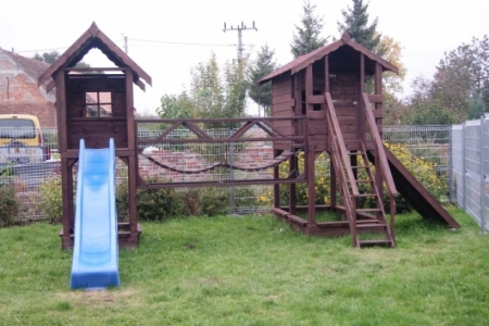 Zakres projektu : budynek drewniany , plac zabaw, altanka, ogrodzenie, zieleń.