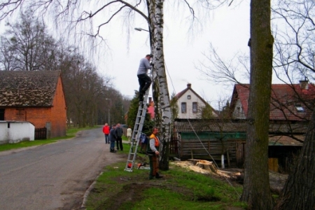 Nikt nie pamięta kto i kiedy je posadził – a lat przybywało. Przechylały się a rosły blisko domu – stawało się coraz bardziej niebezpiecznie. Każdy większy wiatr budził coraz większe obawy, że runął w sposób niekontrolowany. Zebrała się komisja, przyszedł pan Nadleśniczy i postanowili: drzewa trzeba wyciąć. Łatwiej zdecydować a trudno ściąć takie wielkie drzewa rosnące blisko domów i w dodatku na skarpie. Odetchnęliśmy z ulgą, gdy zgodził się na to pan Jerzy Nowacki. Wiedzieliśmy, że ma doskonały sprzęt i jeszcze lepsze kwalifikacje. Cała operacja wycinania wielkich drzew przeszła bezbłędnie a pan Jerzy Nowacki zrobił to bezinteresownie za co pięknie dziękujemy.