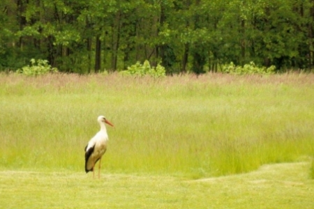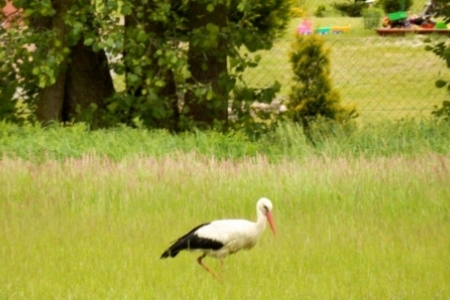Poszperał, poczytał … i jest. Do Rudy Milickiej na plac rekreacyjny, o którym wiedzą już w Dolinie Baryczy przybył BOCIAN BIAŁY. Wylądował na naszym boisku i kroczył dumnie nie przejmując się wycieczką rowerową na ścieżce, wjeżdżającym na plac pod wiatami samochodem i spacerującymi mieszkańcami.