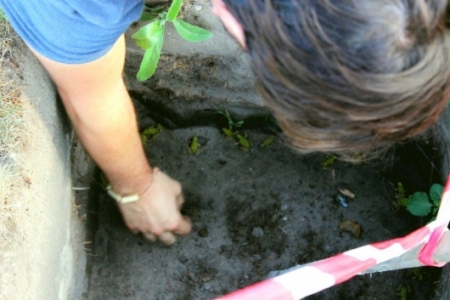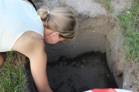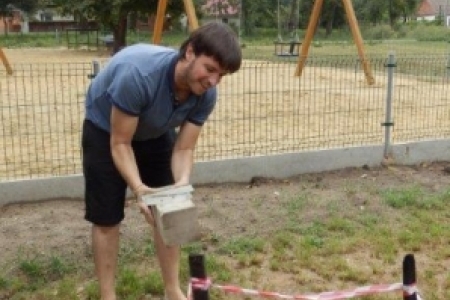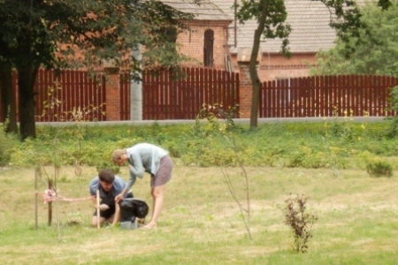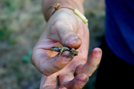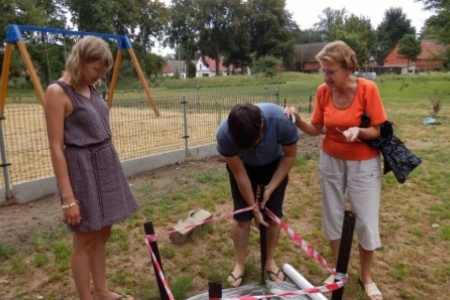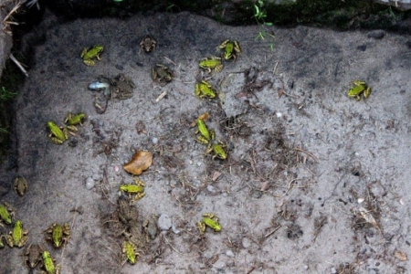 Na naszym placu zostało wykopanych sześć dołów pod osadzenie siłowni zewnętrznych. Ponieważ zamontowanie siłowni trochę się opóźniło, to otwory zostały zabezpieczone taśmami przed przypadkowym wpadnięciem, ale zabezpieczenie to niestety nie uchroniło żab przed wpadaniem w wykopy. Wskakiwały zresztą świadomie, ponieważ przy wyjątkowych upałach tylko w tych dołach było trochę wilgoci, ale też była to dla nich niespodziewana pułapka. Dno pokryło się małymi uwięzionymi żabkami. Z pomocą przyszli im hiszpańscy ekolodzy, którzy zwiedzając nasz plac ulitowali się nad żabami. Żabki zostały wyłapane do wiaderka i wypuszczone do rowu z wodą a otwory zabezpieczone folią. Ten gatunek żab podlega w Polsce ścisłej ochronie a więc powodów do uśmiechów było więcej. Ani i Raulowi dziękujemy.