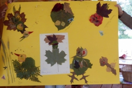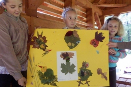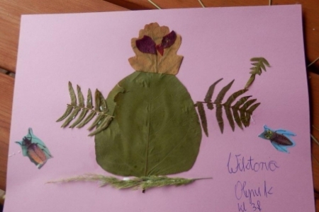 Dzieci przygotowują się do festynu. Temat festynu wynika oczywiście z charakteru naszej wioski ptasiej – będziemy żegnać ptaki na rok. Dlatego zabawa i prace plastyczne dzieci były związane z jesiennymi liśćmi, za pomocą których dziewczynki (bo tylko one przyszły) układały ptaki. Powstawały ptaki liściaki no i trochę dziwaki. Temat zaczerpnęliśmy z pomysłu Czesława Rodziewicza, którego „Liściaki” znane są we Wrocławiu i nie tylko. Dziewczynki szybko „złapały” zasadę tworzenia ptaków, choć metody stosowały różne: Marianna „na czas”, Agnieszka „na bogato”, Julka „skromnie” a Patrycja jako jedyna „w poziomie”. Dzisiaj prezentujemy to co powstało w ciągu godziny a niespodzianką będą prace, które dziewczynki przygotują w domu.