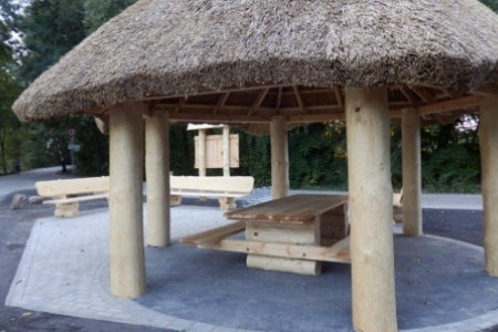 A wracając do grobli to warto (mimo wszystko) dojść do pięknej wiaty i chwilę posiedzieć wszak nad głową solidny dach kryty strzechą.